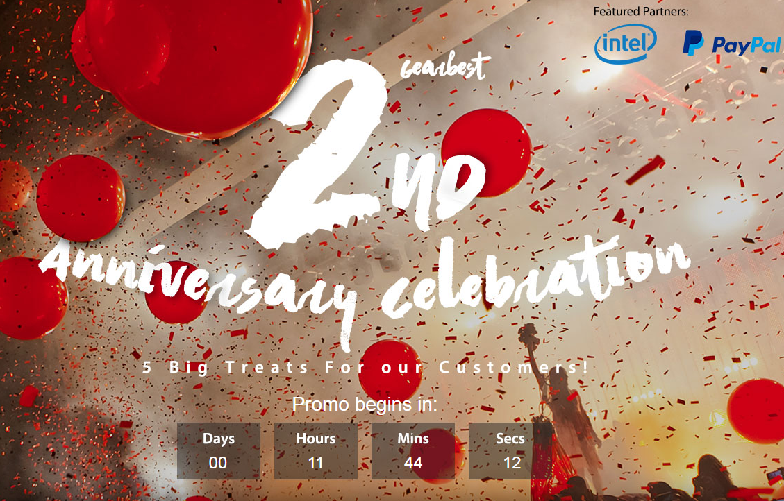 Популярный интернет-магазин GearBest.Com анонсирует большую распродажу на смартфоны, планшеты, компьютеры, а также другую технику и электронику в честь своего двухлетия. Распродажа начнётся 21 марта в 17:00 по московскому времени. Патрнёрами акции выступают междунарожные компании PayPal и Intel.