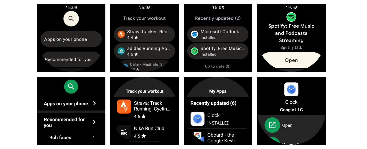 В новом магазине приложений для смарт-часов иконки утилит стали круглыми и уменьшились по размеру. Кроме того, был уменьшен размер используемого шрифта. Изменения позволяет отображать в одних и тех же сценариях больше полезной информации. Фон значка поиска был изменён с зелёного на белый.