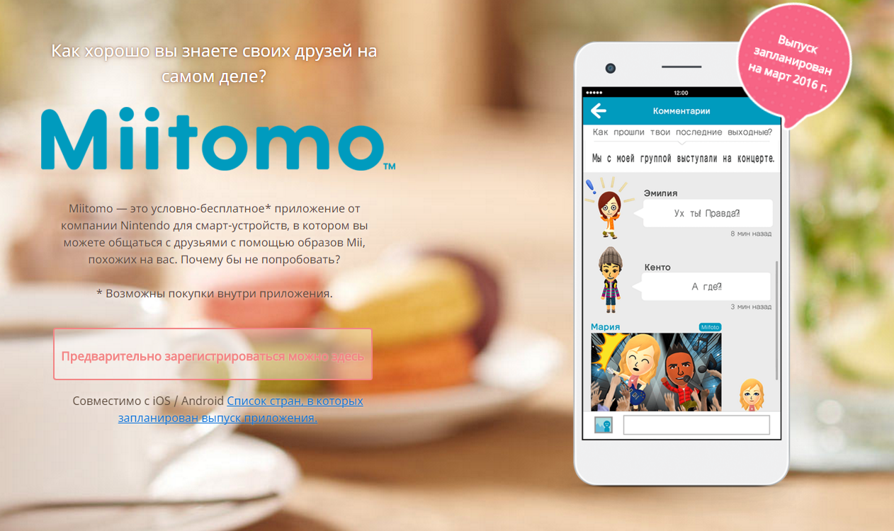 Компания Nintendo открыла предварительную регистрацию пользователей для загрузки своей первой игры для смартфонов и планшетов. Сам релиз Miitomo для мобильных устройств, работающих под управлением операционных систем iOS и Android, состоится в середине марта 2016 года.