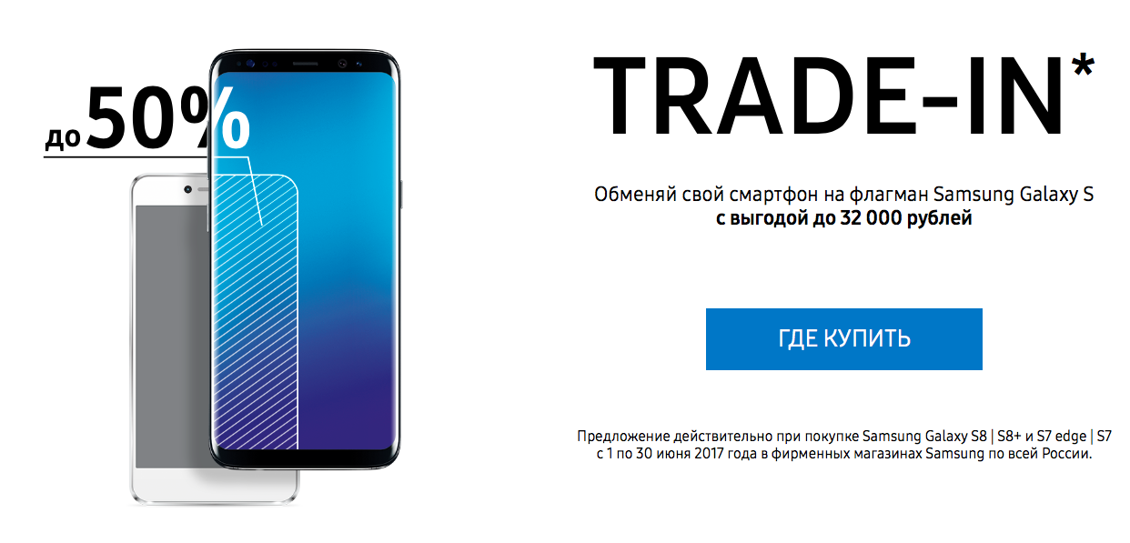 В России начала действовать программа Samsung Trade-In, по которой можно купить флагманские смартфоны Samsung Galaxy S8, Galaxy S8+, Galaxy S7 edge и S7 по сниженной цене, если пользователь сдаст свой старый смартфон.