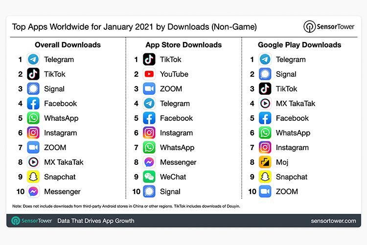 Аналитический центр Sensor Tower поделился свежей статистикой о самых скачиваемых мобильных приложениях неигрового сегмента за январь 2021 года. Telegram стал самым скачиваемым у пользователей Android и вторым по популярности на iOS. Общее количество установок мессенджера достигло 63 млн, что в 3,8 раза больше, чем в январе прошлого года.