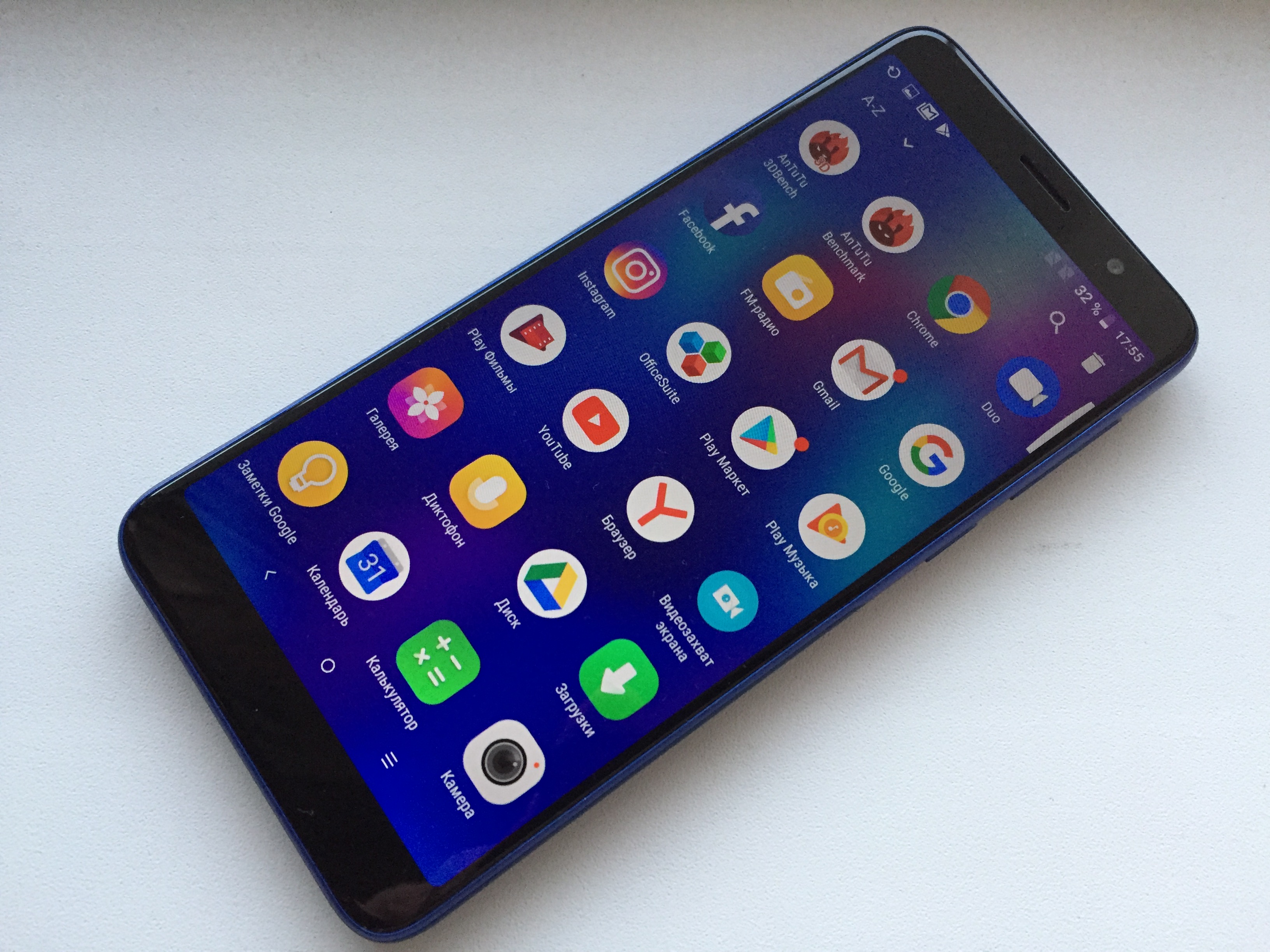 Дисплей у телефона имеет диагональ 5,5 дюймов. Выполнен он по технологии IPS, обладает разрешением 720x1440 (295 ppi), чего вполне достаточно для комфортного использования. Яркий экран позволяет просматривать информацию под любым углом. Данные неплохо читаются даже на солнце. Дисплей защищён закруглённым 2,5D-стеклом.