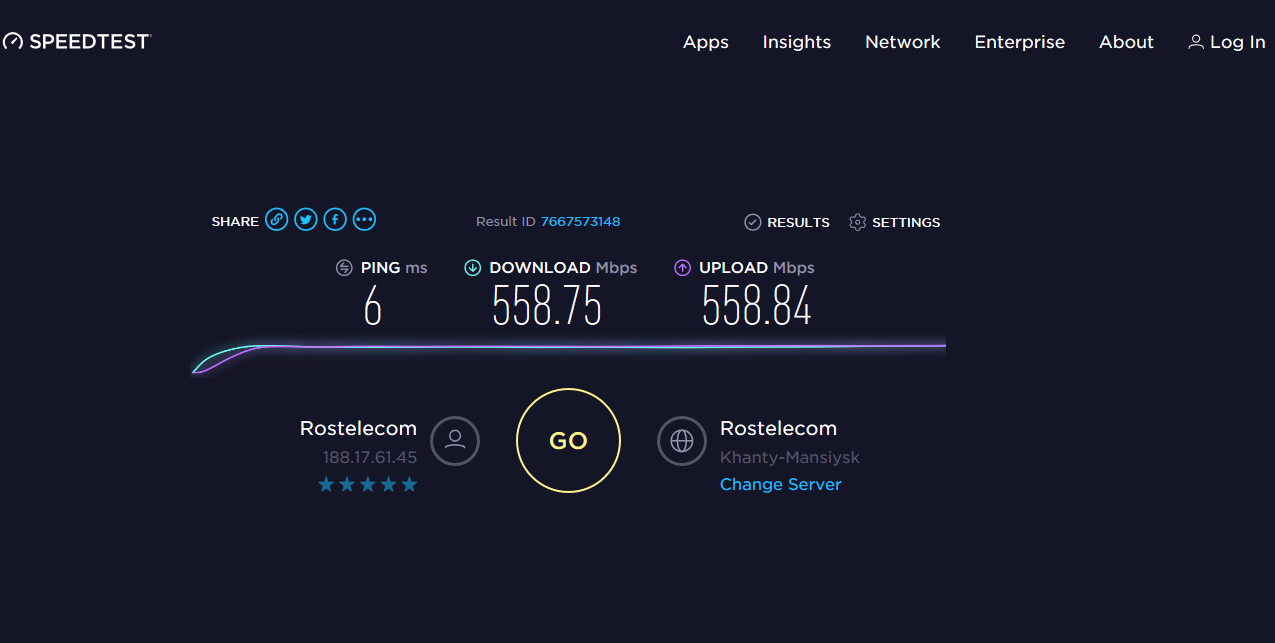 «Ростелеком» в качестве максимально возможной скорости заявляет 500 Мбит/с. Такая скорость предоставляется на топовых пакетах услуг с интерактивным телевидением. Для получения более высокой скорости не нужно прокладывать отдельный кабель по дому и платить дополнительные деньги. В распоряжении клиентов «Ростелекома» также значатся тарифы со скоростями в 50, 120, 150 и 200 Мбит/с. Средние скорости по абонентской базе составляют 90 Мбит/с (согласно карте замеров скоростей Speedtest).