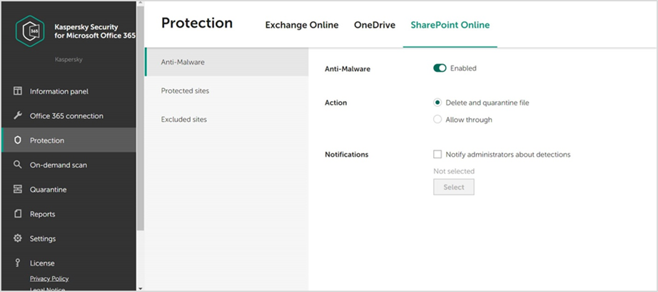 Кроме того, продукт Kaspersky Security для Microsoft Office 365 не допускает распространения вредоносных программ по корпоративной сети через хранилищe SharePoint Online. Решение сканирует каждый файл сразу после его загрузки в Microsoft Teams и, если видит зловред, немедленно перемещает его в карантинную зону, а сотрудник IT-отдела получает отчёт о результатах детектирования и статистику. Также администраторы могут вручную настроить список сканируемых сайтов.