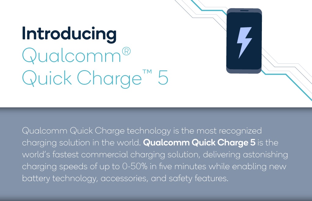Компания Qualcomm представила технологию быстрой зарядки Quick Charge 5 (QC5), предназначенную для флагманских мобильных устройств на базе процессоров Snapdragon 865, Snapdragon 865 Plus, оснащённых батареями большой ёмкости. По заявлениям производителя, QC5 до 10 раз быстрее оригинальной зарядки Quick Charge 1, представленной в 2013 году, и до 4 раз быстрее Quick Charge 4, которая появилась на рынке в 2017 году.