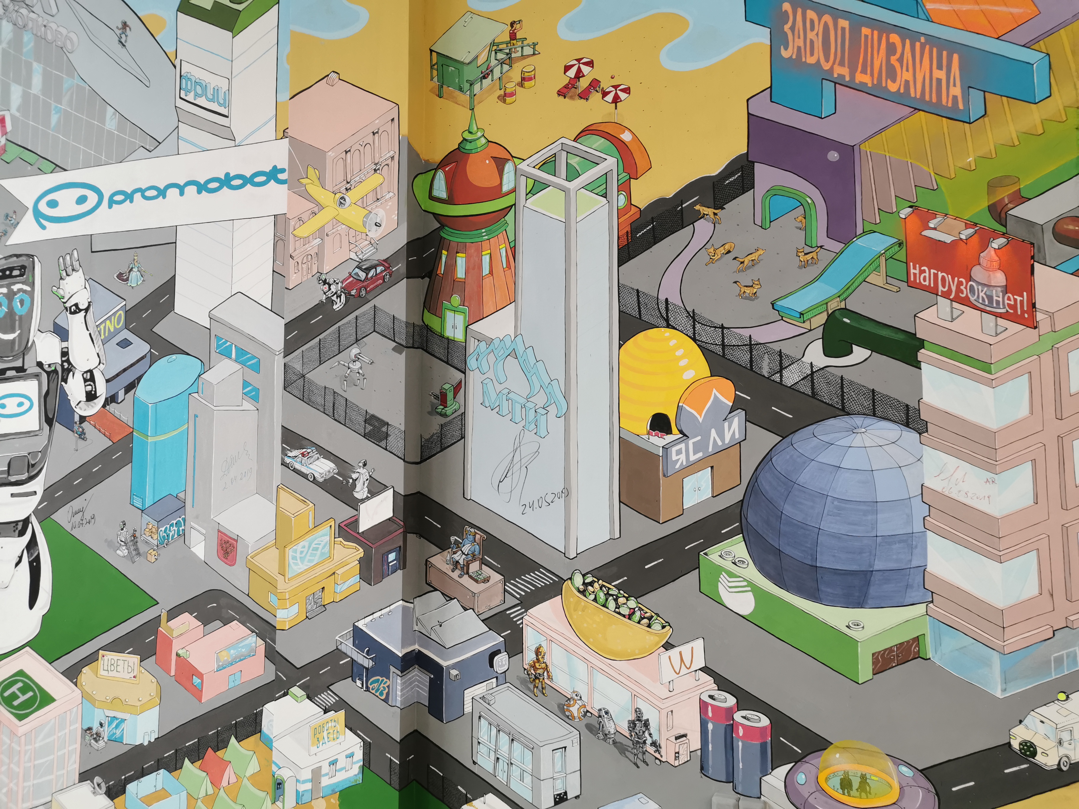 Офис и производственная площадка выполнены в самом современном стиле. На входе гостей встречает стена с большим рисунком, на котором изображена история создания компании и первых промоботов.