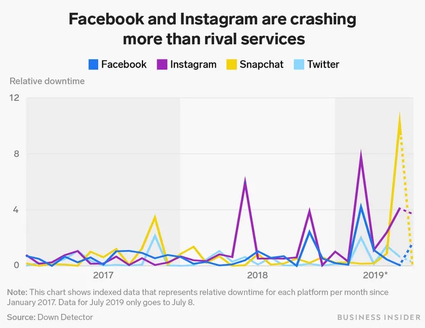 Сервис Downdetector опубликовал статистику сбоей по всем крупнейшим социальным сетям в мире за последние 12 месяцев и обнаружил, что с начала 2019 года время простоя Instagram и Facebook многократно выросло, а у конкурирующих сервисов — нет.