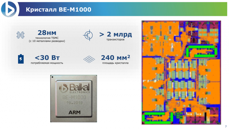 Процессор BE-М1000 выпускается по 28-нм техпроцессу на производственных мощностях TSMC, состоит из более чем 2 млрд транзисторов и имеет площадь кристалла порядка 240 мм2. Тепловой пакет чипа составляет менее 30 Вт.