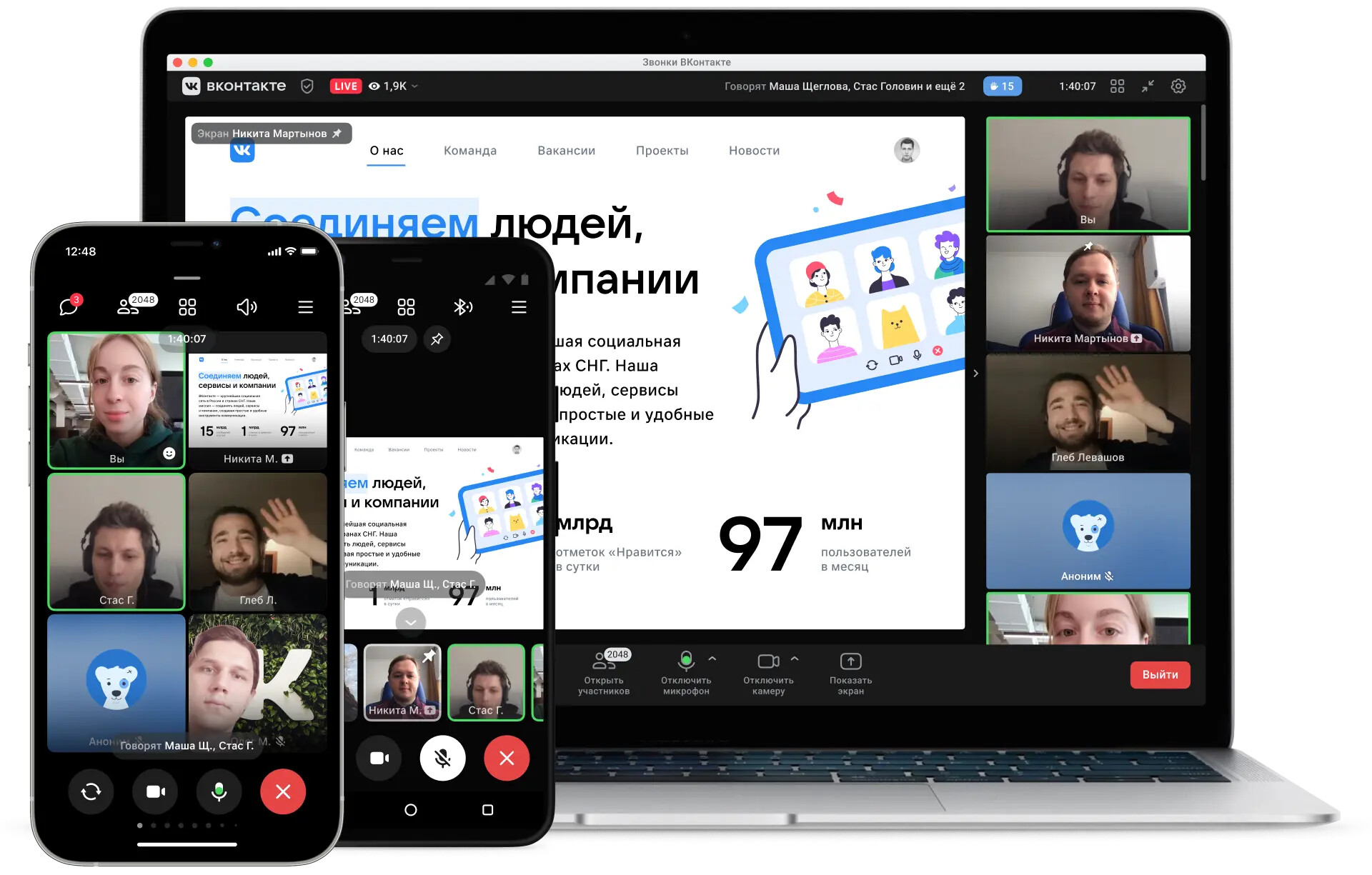 В одной конференции могут принять участие пользователи не только самого приложения, но и веб-версии. Разработчики обещают высокое качество звука, видео и возможность демонстрации экрана в разрешении 4K. Также пользователи смогут использовать AR-фоны, которые были созданы для раздела клипов «ВКонтакте».