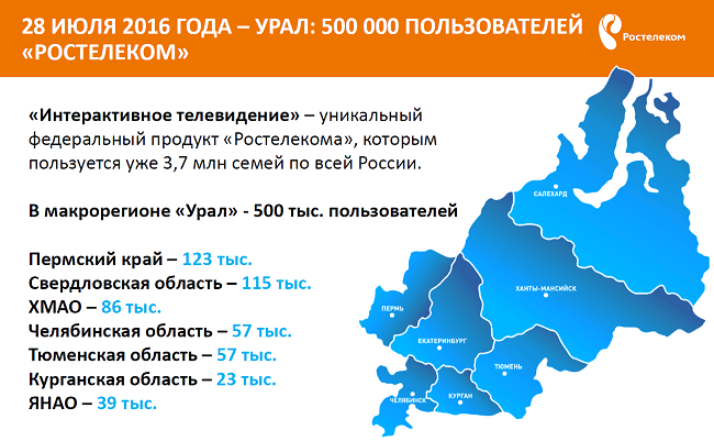 «Интерактивное ТВ» сегодня является нашей самой быстрорастущей услугой, одним из драйверов развития бизнеса «Ростелекома». Благодаря именно «Интерактивному ТВ» в первом полугодии 2016 года «Ростелеком» обеспечил более половины всех новых подключений к услугам платного телевидения в России. В Уральском макрорегионе за последние три года количество пользователей «Интерактивного ТВ» выросло почти вдвое: сегодня пользователем телевизионного продукта «Ростелекома» является каждая десятая уральская семья».