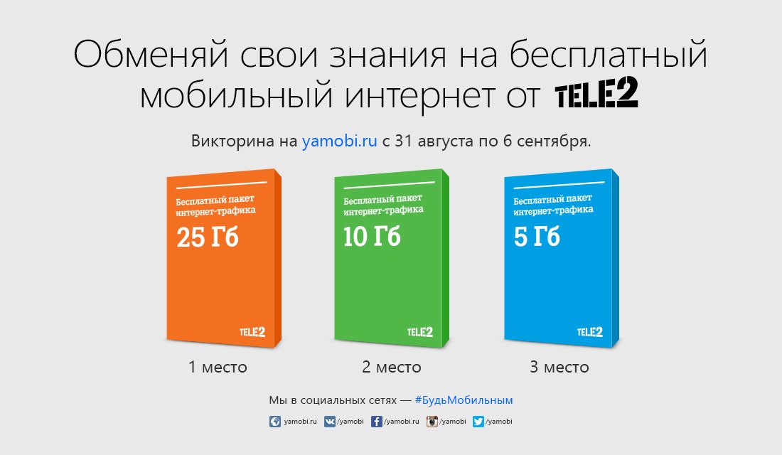 www.yamobi.ru 7 сентября 2015 года. Если призёром стал человек, который не является абонентом Tele2, то ему предоставляется возможность подключиться к сети оператора бесплатно, выбрать номер и подключить бесплатный пакет мобильного интернета.