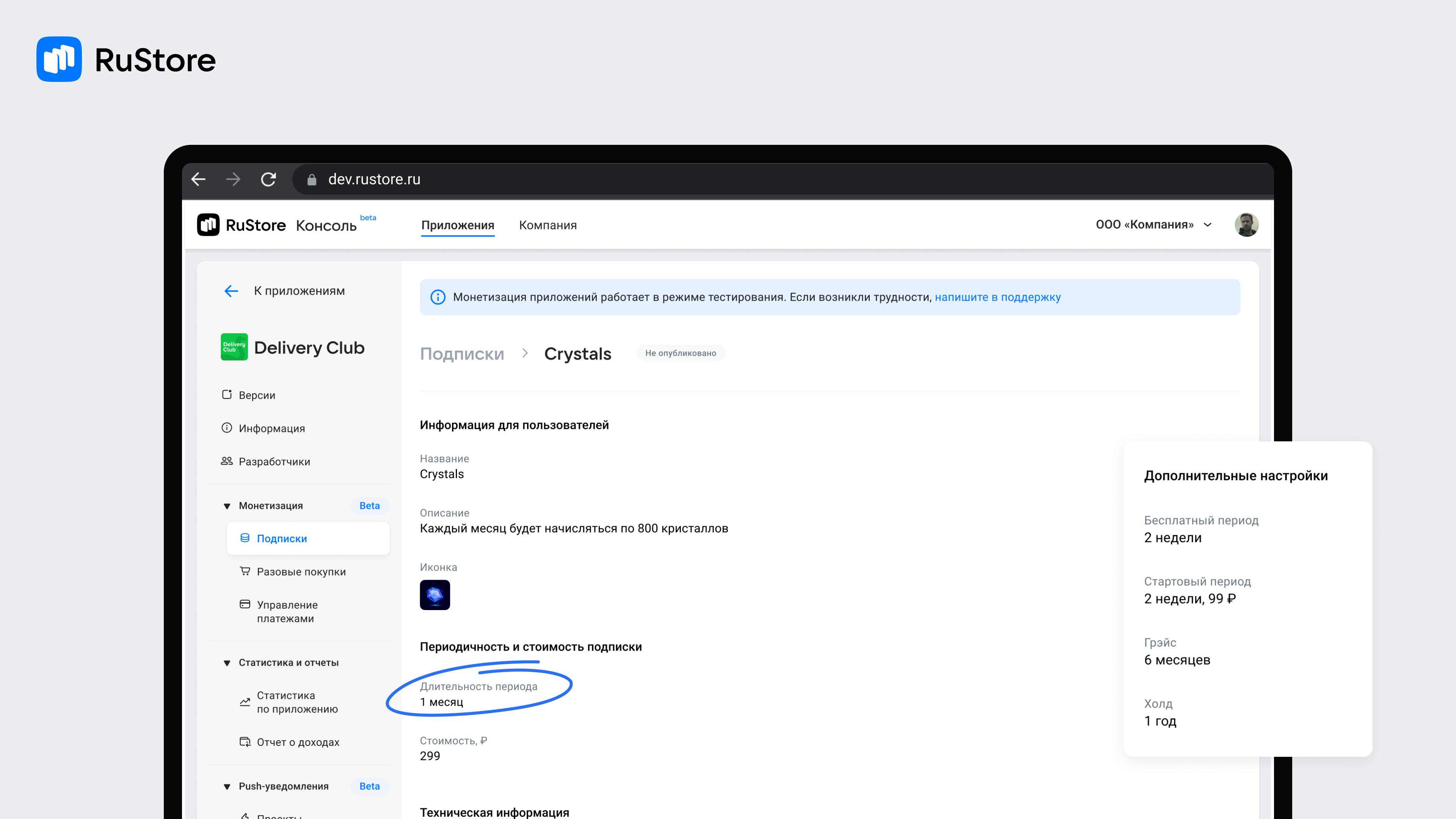 Если разработчик монетизирует свое приложение в RuStore путем платной подписки, он может на странице приложения указать длительность подписки и другие параметры или ограничения по оплате. Монетизировать приложение можно и разовыми платежами, например, при платежах за игровую валюту или доступ к новому игровому уровню.