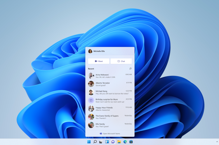 После установки обновления на панели задач появляется соответствующая иконка, нажав на которую можно открыть окно чата. Кроме того, вызвать окно чата в любом месте можно нажатием клавиш Win + C, ранее эта комбинация использовались для запуска голосового ассистента Cortana. После запуска окна чата можно перейти к работе с полноценным приложением Teams, которое переработано под Windows 11.